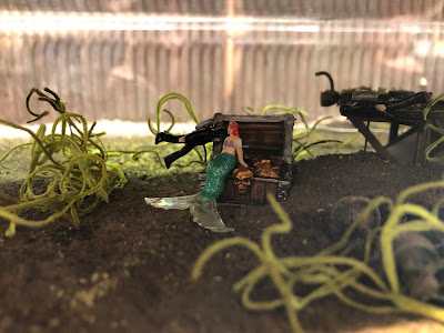 This post would not be complete without a peek underwater. Eric Vannice recently completed installing a mermaid down there, guarding a couple of large treasure chests from some interested divers groping around between some derelict cars that had fallen off the barge. It's hard to see in the dark, but it's there...